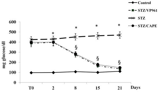 Figure 2. Effects of CAPE and VP961 on blood glucose content during the experimental period. Values are mean ± standard deviation (S.D.) of three independent experiments performed in triplicate. * p < 0.05 vs. normal control rats; § p < 0.05 vs. diabetic control rats (STZ).
