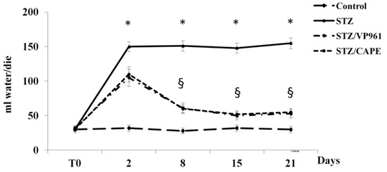 Figure 3. Effects of CAPE and VP961 on water intake during the experimental period. Values are mean ± standard deviation (S.D.) of three independent experiments performed in triplicate. * p < 0.05 vs. normal control rats; § p < 0.05 vs. diabetic control rats (STZ).