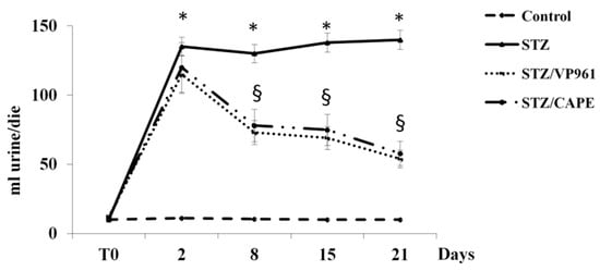 Figure 4. Effects of CAPE and VP961 on volume of urine excreted during the experimental period. Values are mean ± standard deviation (S.D.) of three independent experiments performed in triplicate. * p < 0.05 vs. normal control rats; § p < 0.05 vs. diabetic control rats (STZ).