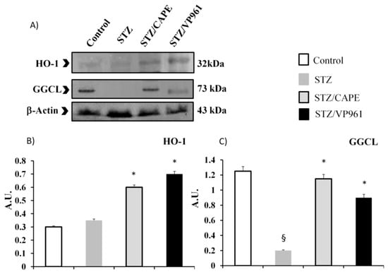 Figure 5. Representative Western blotting of HO-1 and GGCL protein expressions (Panel A). Densitometric quantification of HO-1 and GGCL protein expressions in the pancreas of non-STZ rats (control), STZ rats, and CAPE- or VP961-treated STZ rats (CAPE/STZ; VP961/STZ) (Panel B,C). Values are mean ± standard deviation (S.D.) of three independent experiments performed in triplicate. * p < 0.05 vs. diabetic control rats (STZ); § p < 0.05 vs. normal control rats.