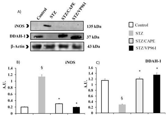 Figure 6. Representative Western blotting of iNOS and DDAH-1 protein expressions (Panel A). Densitometric quantification of iNOS and DDAH-1 protein expressions in the pancreas of non-STZ rats (control), STZ rats, and CAPE- or VP961-treated STZ rats (CAPE/STZ; VP961/STZ) (Panel B,C). Values are mean ± standard deviation (S.D.) of three independent experiments performed in triplicate. * p < 0.05 vs. diabetic control rats (STZ); § p < 0.05 vs. normal control rats.