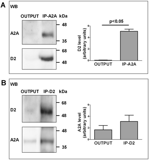 The capability of A2A and D2 receptors on striatal astrocytes to physically interact was investigated by co-immunoprecipitation assay on purified striatal astrocyte processes. By co-immunoprecipitation, we found that the A2A and the D2 receptors expressed on the striatal astrocytic processes physically interact. In particular, as shown in Figure 1, by analyzing immunoprecipitated and output material by immunoblotting using the anti-D2 and the anti-A2A antibodies whose high specificity was previously verified [33,34,35,36,37,38], we found that the D2 receptor almost completely immunoprecipitated together with the A2A receptor. Conversely, only a fraction of the A2A receptor was found to immunoprecipitate together with the D2 receptor. The findings indicate that the D2 receptor expressed on the striatal astrocytic process is completely associated with the A2A receptor, while the A2A receptor can be also found not associated with the D2 receptor.