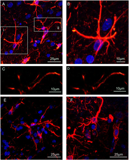 For GFAP colocalization analysis, after the amplification step the slices were rinsed in Wash Buffer A, incubated with goat anti-GFAP in Antibody Diluent solution in a humid chamber overnight at 4 °C and subsequently with Alexa Fluor 546-conjugated donkey anti-goat for 1 h at room temperature. After incubation in DAPI labeling solution, the sections were rinsed in PBS, mounted in a glycerol/PBS (1:1) solution and examined under a confocal laser scanning microscope (SP2 AOBS, Leica Microsystems, Mannheim, Germany). Negative control experiments were conducted avoiding the conjugation of the primary anti-A2A or anti-D2 antibody with the Duolink Probes and resulted in a complete lack of stain for PLA (see Figure 2E,F). The specificity of the double immunolabeling was verified by replacing the primary antibodies with PBS [49].