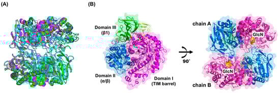 The structure of GlmAPh was deduced using the single-wavelength anomalous dispersion of selenomethionine atoms and refined at 2.60-Å resolution (PDB 5GSL) [15]. The structure of GlmAPf and GlcN-bound GlmATk was determined at 1.75-Å resolution (PDB 6JOW, unpublished) and 1.27-Å resolution (PDB 5GSM) [15], respectively, using molecular replacement of the structure of the GlmAPh monomer as the search model. The structures of GlmAPh and GlmAPf showed little variation to that of GlmATk, as reflected in the RMSD values of 0.90 Å for 767 Cα atoms and 0.74 Å for 751 Cα atoms, respectively (Figure 1A). Moreover, both proteins shared high sequence identity with GlmATk (63%) and the active site architecture is fully conserved among these GlmAs (see Section 4.1). These results suggest that general aspects of these proteins, such as the structural features and the catalytic mechanisms, are very likely to be equivalent. GlmAPf has been described as a putative β-galactosidase [2,14]. However, structural analysis results indicate that it must be an exo-β-D-glucosaminidase. The highest-resolution complex structure of GlmATk is described throughout this review unless otherwise noted.