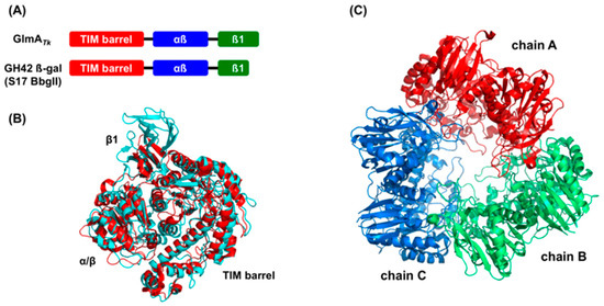 Structural comparison between GlmATk and GH42 β-galactosidases. The comparison was performed with five GH42 β-galactosidases, but, for clarity, only the result of BbgII (PDB 4UZS) is shown in the figure. (A) Schematic presentation of the domain organization of GlmATk and BbgII; (B) The superimposed models of the monomer structure of GlmATk (cyan) and BbgII (red). The figure was drawn in the same orientation as in the left panel of Figure 1B; (C) Trimeric structure of BbgII (chain A: red, chain B: green, chain C: blue).
