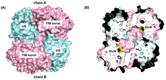 As shown in Figure 1B and Figure 6B, the active sites of GlmATk are located within a deep pocket that intrudes into the core of the TIM-barrel domain of each monomer. Such active sites may act independently and their entrances, which are the only means of passage for substrates and products, are created by a reciprocal donation of each monomer. That is, the 310-helix of the α/β-domain of chain A interacts with the TIM-barrel domain of chain B, narrowing the active site entrance. As a result, the distance of subsite -1 from the active site entrance is approximately 20 Å (Figure 6A,B), which may contribute to a size selection. Indeed, GlmATk showed higher activity against GlcN2 (approximately 12 Å in length) and its activity decreased in proportion to the length of the chitooligosaccharide chain [2]. These results suggest that dimer formation enables GlmATk to form an active site with an appropriate shape for binding smaller substrates.