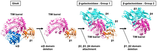 Hypothetical evolutionary pathway from GlmA to GH35 β-galactosidases. TIM-barrel domain, α/β: domain, β1 domain, and β2–β4 domains are colored magenta, blue, orange, and cyan, respectively.