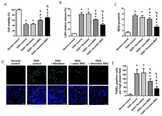 Effect of thrombin priming on neuroprotective efficacy of mesenchymal stem cells (MSCs) in vitro oxygen–glucose deprivation (OGD)-induced primary cultured rat cortical neurons. (A) Cell viability, expressed as relative proliferation rate (%) to normal control group; (B) cytotoxicity, expressed as relative lactate dehydrogenase (LDH) release (%) to positive control (100% fully killed cells); (C) malondialdehyde (MDA) level; and (E) the number of terminal deoxynucleotidyl transferase dUTP nick end labeling (TUNEL)-positive cells captured using fluorescent microscopy (D) green, original magnification; ×400, scale bars; 20 μm) evaluated in the rat cortical neurons 24 h after co-culture with fibroblasts, naïve MSCs, or thrombin-primed MSCs (n = 6/group). Data are expressed mean ± SD. * p < 0.05 vs. normal control. # p < 0.05 vs. OGD control. $ p < 0.05 vs. OGD + fibroblasts. % p < 0.05 vs. OGD+naïve MSCs.