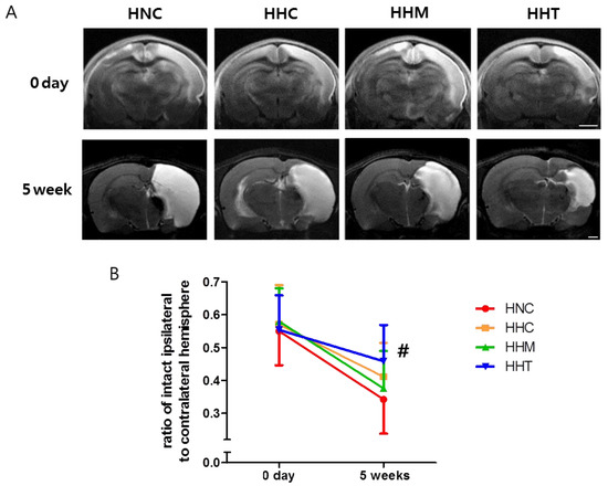 Effect of thrombin-primed MSCs on brain infarction 5 weeks after hypoxic ischemic encephalopathy (HIE). (A) Representative brain magnetic resonance images from treatment groups at 0 days (diffusion-weighted image, upper penal) and at 5 weeks (T2-weighted image, lower penal) after HIE induction. Scale bar = 1 mm (B) Volume ratio of ipsilateral intact area to the contralateral whole brain area measured by magnetic resonance images (n = 17, 21, 16, and 14 in the HIE injury control group (HNC), hypothermia treatment alone group (HHC), combined hypothermia and naïve MSCs group (HHM), and combined hypothermia and thrombin preconditioned MSCs group, respectively). Data are expressed as mean ± SD. # p < 0.05 vs. HNC.