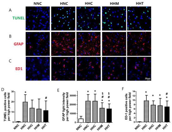 The number of ED-1-positive cells, indicative of activated microglia, significantly increased in all HIE groups compared to NNC in the peri-infarct brain area on P10, and this increased number of ED-1 positive microglial cells observed in HNC was significantly attenuated in HHT but not in HHC or HHM (Figure 3C,F).