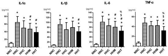 The levels of pro-inflammatory cytokines such as interleukin (IL)-1α, IL-1β, IL-6, and tumor necrosis factor (TNF)-α were significantly increased in all HIE groups compared to NNC (Figure 4). Increased levels of IL-1α and IL-6 observed in HNC were significantly attenuated both in HHM and HHT but not in HHC; the increased levels of IL-1β and TNF-α observed in HNC were significantly attenuated only in HHT but not in HHC or HHM.
