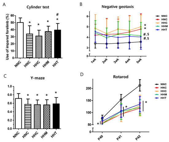 In the cylinder test, limb-use asymmetry was significant in all the HIE groups compared to NNC, and limb-use asymmetry observed in HNC was significantly improved only in HHT but not in HHC or HHM (Figure 5A). In the negative geotaxis test, NNC presented a short duration for rotating, indicating a quick response time and intact sensorimotor function, and the HNC displayed a significantly longer duration, indicative of impaired function, than NNC (Figure 5B). The prolonged negative geotaxis test observed in HNC at 5th week after HIE induction was significantly improved both in HHM and HHT but not in HHC. All HIE groups showed significantly impaired Y-maze test (Figure 5C) and rotarod test (Figure 5D) compared to NNC, and these impaired Y-maze and rotarod tests observed in HCN were not significantly improved in HHC, HHM, or HHT.