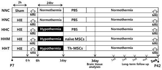All animal protocols were reviewed by the Institutional Animal Care and Use Committee (IACUC), and the animals were housed in our AAALAC-approved facility (Samsung medical center). Male sprague-Dawley rats (Orient Co., Seoul, Korea) at postnatal day (P) 7 were raised with their dam rats in the standard cage, except during the hypothermia period. Dam rats had free access to water and chow in an alternating 12-h light/dark cycle in a constant humidity and temperature environment. We assessed and monitored the condition of rat pups regularly, four times per day during the animal studies. As we previously described [12], HIE was induced by ligation of unilateral (right side) carotid artery and exposure to 8% oxygen for 2 h. The rat pups were randomly allocated into five experimental groups in a blind manner as follows: normal (sham) with NNC; HIE with HNC; HIE with HHC; HIE with HHM, and HIE with HHT. Induction of severe HIE involving more than 40% of the ipsilateral hemisphere volume was confirmed by magnetic resonance imaging (MRI) of brain after 2 h of modeling, and then 24 h of hypothermia intervention followed in a hyperthermia chamber set at 32 °C within 3 h after HIE induction. As a control, normothermia chamber was set at 36 °C for the same period. Throughout the 24 h of temperature intervention, pups were fed five times with 0.5 mL of milk formula using a 22 gauge feeding needle. During the temperature intervention period, rectal temperatures of rat pups were monitored (Supplementary Figure S2). Brain tissues were obtained for histological and biochemical analyses at P11 (3 days after HIE induction). In long-term follow-up study, MRI was performed at P42 (5 weeks after HIE induction), and functional behavioral tests were performed from the first week to the fifth week after HIE induction, depending on the timing of the functional test. Figure 6 displays the experimental schedule and groups in the present study.