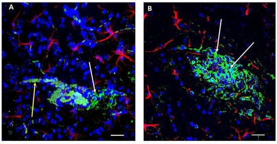 Immunostaining was performed using a protocol previously established in our laboratory [,]. Frozen 30-µm sections were generated from brain cortex containing the tumor(s). The sections were blocked with 5% normal goat serum/5% normal horse serum (Vector Laboratories, Burlingame, CA, USA) in 0.10 M phosphate buffer solution (PBS: NaCl, 137 mM; KCl, 2.70 mM; Na2HPO4, 10.14 mM; KH2PO4, 1.77 mM) containing 0.3% Triton X-100 and 0.05% phenylhydrazine for 60 min for permeabilization and then processed separately using two different antibodies against Aβ. For that purpose, slices were incubated with a rabbit polyclonal antibody to Aβ (Abcam, Cambridge, MA, USA, cat. #ab2539) diluted 1:400 in 0.03% Triton X-100, 1% dimethyl sulfoxide (DMSO), 2% bovine serum albumin (BSA), 5% normal horse serum, and 5% normal goat serum in 0.1 M PBS. Anti-GFAP–Cy3 (1:200) was added, and the slice left overnight at 4 °C. After three washes with permeabilization solution for 10 min, the secondary antibodies (fluorescein-labeled goat anti-rabbit IgG) were added at a dilution of 1:200 with shaking for 2 h at room temperature and protected from light. The slices were then washed three times with PBS for 10 min and once with distilled water before being transferred onto a glass slide containing Fluoroshield mounting medium (Sigma-Aldrich, St. Louis, MO, USA, cat. #F6057) with DAPI. Negative controls were routinely performed by removal of primary antibody in each staining experiment to validate the immunohistochemical staining quality and results.