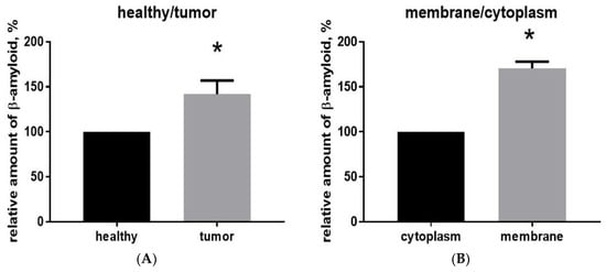 To determine more precisely there Aβ is distributed, we separated the cytoplasmic and membrane fractions of proteins from glioma cells from the main tumor extracted from the brain of animals 16 days after implantation. Before processing, blood cells were eliminated from the tumor tissue samples using the Percoll purification method. Membrane and cytoplasmic proteins were isolated, and the total protein content was determined using the Bradford spectrophotometric method to establish a reference point for measuring the amount of Aβ in each fraction. Using ELISA, it was found that the relative amount of Aβ40 in the membrane fraction is significantly greater (170 ± 4%, p < 0.001, t = 16.23, df = 4, n = 3) than in the cytoplasmic fraction (Figure 2B).