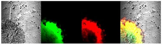 Aggregated amyloid visualized by staining with thioflavin T (green) and thioflavin S (red) inside the glioma tumor body. The white arrow shows the glioma tumor body visible in the brain slice.