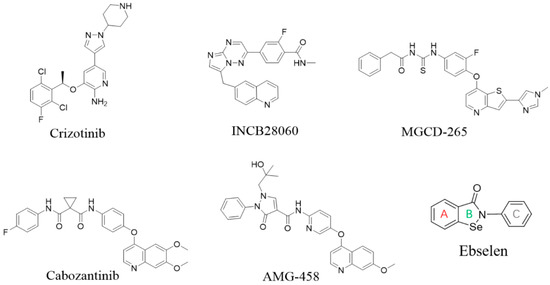 Preliminary studies have suggested that it is feasible to design antitumour molecules using BISA as a scaffold. Remarkably, isothiouronium-modified compounds have a wide variety of significant pharmacological activities, such as antimicrobial and antitumoural effects [22,23,24,25]. Compound MGCD-265 (Figure 1), with its acyl thiourea linkage (a key structural motif), showed potent inhibition of MET phosphorylation (with an IC50 of 8.7 nM) in epidermoid carcinoma cells (A431) stimulated by human recombinant HGF. Based on these pioneering studies, in this study, we intended to use the strategy of virtual screening to handle a molecular library generated using BISA as the scaffold, and carried out virtual screening against c-Met. In silico 300 BISAs compounds were designed and according to the predicted binding affinities of these benzisoselenazolone derivatives given by docking and MM/GBSA, four series of benzoisoselenazol-3(2H)-one derivatives were synthesised (Section 2.2) and their biological activity was evaluated. We hope that these compounds can provide guidance for the design of BISAs antineoplastic compounds inhibiting c-Met signalling pathways.