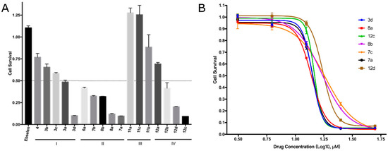 Effects of the tested compounds on cell viability of EBC-1 cancer cell line. (A) Percentage of viable cells (EBC-1) after 72 h exposure to the compounds at a concentration of 25 μM compared to the compound-free control received an equal volume of DMSO (100% viability). Each value was calculated from two independent experiments. The competitive inhibitory activity was expressed as an inhibition rate. (B) Growth inhibition effect of compounds 3d, 7a, 7b, 8a, 8b, 12c and 12d on EBC-1 cells. EBC-1 cells were seeded into 96-well cell culture plates and allowed to grow overnight. Thereafter, cells were treated with vehicle control (DMSO) or the compounds at the indicated concentration for 72 h. After treatment, 10 μL resazurin were added to the culture medium. After incubation at 37 °C for 5 h, fluorescence intensity was measured at a 530 nm excitation wavelength and a 590 nm emission wavelength using a Synergy HT photometer.