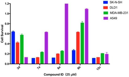 Effects of compounds 3d, 7a, 8a, 8b and 12c on cell viability of four cancer cell lines. Percentage of viable cells (SK-N-SH, DLD1, MDA-MB-231 and A549) after 72 h exposure to the compounds at a concentration of 25 μM. Each value was calculated from two independent experiments. The competitive inhibitory activity was expressed as an inhibition rate.