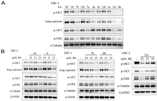 Most of the type-II inhibitors are nonspecific inhibitors that inhibit multiple kinase targets. We selected those compounds with strong antitumour effects to examine their inhibitory effects on the autophosphorylation of c-Met and its downstream signalling pathways (AKT and ERK) in the EBC-1 cells. Phosphorylation of c-Met protein activates downstream signalling pathways to exert corresponding biological effects. The AKT and ERK play an important role in the proliferation and invasion of cancer cells [39,40,41]. The status of p-Met, p-AKT and p-ERK were determined by Western blot assay at a drug concentration near their IC50 values. As shown in Figure 4A, compounds 3d, 7a, 7b, 8a, 8b and 12c significantly blocked c-Met phosphorylation, compared to Ebselen at 25 μM, while no inhibitory effects were observed with the other compounds. Correspondingly, the phosphorylation of AKT and ERK were inhibited to some extent. However, compound 12d, with its strong antitumour effects, did not inhibit the activation of c-Met and downstream signalling pathways AKT and ERK. Other mechanisms might be responsible for its antitumour effects. Subsequently, we examined the inhibitory effects of compounds 3d, 7a, 7b, 8b and 12c on the activation of p-Met, p-AKT and p-ERK in a dose-dependent manner (Figure 4B). All of the tested compounds could inhibit the phosphorylation of Met, AKT and ERK in a dose-dependent manner. Our data proved that nine of the BISAs derived from Ebselen could potently inhibit EBC-1 cancer cell growth by downregulating the activity of c-Met and its downstream signalling pathways AKT and ERK.