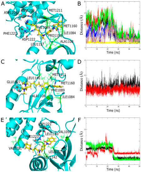 After 20 ns, 12c gradually stabilised at ~2.3 Å (Figure S2C) and, as we can see in Figure 6E, the inhibitor was bound in an extended conformation that stretched from the kinase linker to the pocket, and it also exhibited van der Waals force and hydrophobic interaction with surrounding hydrophobic residues such as ALA1092, LEU1140, LEU1142, LEU1157 and VAL1201. Residues ASP1222 and PHE1223 around the molecule formed hydrogen bonds with the carbonyl group of the B-ring. At the same time, PHE1223 formed hydrogen bond with protonated N atom in the compound. These hydrogen bonds were not stable until 20 ns and moreover, the hydrogen bonding between the carbonyl group of the B-ring with ASP1222 and protonated N atom in piperidine with PHE1223 were very strong (Figure 6F).
