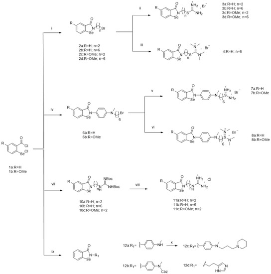 For the benzoisoselenazolone compounds of alkyl isothiourea and 1,1,3,3-tetramethyl-isothiouronium hydrobromide (compounds 3a~d–4), the starting compounds (1a~b) were obtained from the appropriate methyl anthranilate according to the procedure reported previously [31]. Subsequently, 1a and 1b were reacted individually with appropriate bromamine in the presence of Et3N to obtain compounds 2a~d at a 50% to 70% yield. Then these compounds were reacted with thiourea or tetramethylthiourea in boiling THF overnight to obtain target compounds 3a~d–4 at a yield of 40% to 60%. For compounds with alkyl thiourea and tetramethylthiourea on the C ring of Ebselen (compounds 7a~b and 8a~b), the starting material N-methyl-4-nitroaniline derived from p-fluoronitrobenzene [32] was treated with sodium hydrogen and 1,6-dibromohexane to obtain 5 [33]. Afterwards, 6a~b were obtained from treatment of the reduction products of compound 5, which was deoxidised by Fe/HCl (Scheme S1), at a yield of 35% to 40% (a two-step process). Finally, the compounds were allowed to react with thiourea or tetramethylthiourea in boiling THF overnight to obtain target compounds 7a~b and 8a~b at a 45% to 60% yield. Compounds containing guanidine hydrochloride (compounds 11a~c) can be synthesised by the following methods. 9a~9b were prepared from the appropriate aliphatic diamine [34] (Scheme S2). Hereafter, these molecules were reacted with 1a~b to produce 10a~c. Compounds 11a~c can be obtained through deprotection by HCl at high yield. Finally, for other groups or heterocyclic modified benzoisoselenones (compounds 12a~d), N-methyl-4-nitroaniline and its derivative, protected by CbzCl in Scheme S1, were reduced by Fe/HCl and then reacted with 1a to obtain 12a or 12b, respectively. 1-(3-Bromopropyl) piperidine was treated with 12a to produce compound 12c at a yield of 40%. Compound 12d was made by reaction between 1a and histamine with a high resultant yield.