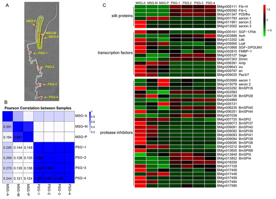 Overview of samples and transcriptome data. (A) Silk gland at full maturation of 5th instar. The single silk gland was divided into MSG-A (anterior segment of the middle silk gland), MSG-M (middle segment of the middle silk gland), MSG-P (posterior segment of the middle silk gland), PSG-1, PSG-2, PSG-3, and PSG-4. Red boxes indicate where the samples were collected. (B) Pearson correlation analysis of samples. The number is the correlation coefficient between each two samples. (C) Heatmap of silk protein-related genes, including silk protein genes, transcription factors, and protease inhibitors.