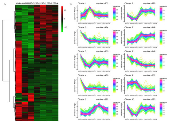 To better understand how this obvious classification was produced, differentially expressed gene (DEG) analysis was performed. Genes with FPKM ≥ 5 were considered expressed. FDR ≤ 0.001 and |Log2Ratio| ≥ 1 were set as criteria for screening DEGs. Using this approach, 3121 DEGs were identified in the seven sections of the MSG and PSG. We used hierarchical clustering to comparatively visualize the DEGs in the seven samples (Figure 2A). The heatmap indicated that the DEGs mainly exhibited tissue-specific expression in the silk gland, which was in line with the Pearson correlation data. Intriguingly, DEGs in the MSG-A had the highest expression levels compared with those in the other sections. Further coexpression analysis grouped all these DEGs into ten clusters (Figure 2B). DEGs from cluster 1 included 202 MSG-P high-expression genes, DEGs from cluster 4 included 430 MSG-A high-expression genes, DEGs from cluster 5 included 282 PSG-2 high-expression genes, DEGs from clusters 6 and 7 included 544 PSG high-expression genes, DEGs from cluster 9 included 252 MSG high-expression genes, and DEGs from clusters 2 and 8 included 773 gradually upregulated genes. All DEGs were well classified.