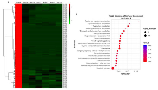 The genes in cluster 4 showed distinct characteristics, with specific and high-level expression in the anterior MSG. We screened the cluster 4 genes according to fold change ≥ 2 in MSG-A versus the other samples and gene expression levels of other samples < 5. Thus, 126 genes that were specifically and highly expressed in the MSG-A were detected (Figure 4A, Table S3). KEGG pathway enrichment analysis of these 126 genes revealed that tryptophan metabolism, glyoxylate and dicarboxylate metabolism, FoxO signaling pathway, and peroxisome pathways were significantly enriched (Figure 4B). Three catalases (BMgn012691, BMgn014284, BMgn014510) were involved in these four significantly enriched pathways. Four cytochrome P450 genes (BMgn007168, BMgn007195, BMgn014043, BMgn014046), all of which belong to the CYP4 family, were identified to be specifically and highly expressed in MSG-A. Five serine protease inhibitors, including BMgn003292, BMgn006251, BMgn009073, BMgn009095, BMgn013655, were specifically expressed in the anterior MSG. Among them, BMgn003292 (BmSPI16) contains the serpin domain, BMgn006251 (BmSPI44), BMgn009073 (BmSPI37), BMgn009095 (BmSPI36) contain the TIL domain, and BMgn013655 (BmSPI68) contains the kazal domain, which may be involved in resistance to pathogenic microorganisms [25]. Six genes (BMgn006273, BMgn007037, BMgn009192, BMgn009198, BMgn013708, BMgn015270) involved in ion and small-molecule transport were detected. Ecdysone oxidase (BMgn000158) was also strongly expressed in the anterior MSG. It is a key enzyme that converts ecdysone into 3-dehydroecdysone and inactivates ecdysone [26].