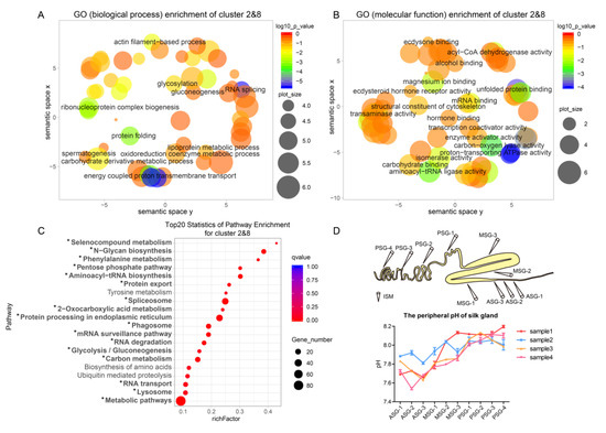 Functional analysis of gradually upregulated genes. (A,B) GO scatterplot constructed with REVIGO for gradually upregulated genes related to biological process (A) and molecular function (B). (C) KEGG pathway enrichment analysis of gradually upregulated genes in cluster 2 and cluster 8. “*” (qvalue < 0.05) represents a significantly enriched pathway. (D) Detection of the peripheral pH of the silk gland by ion-selective microelectrode (ISM).