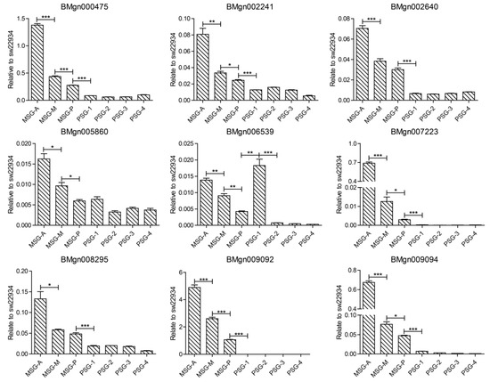 Nine genes with gradually upregulated expression pattern were verified by quantitative RT-PCR; the expression levels of all nine genes gradually increased from the PSG to the MSG, and the major expression differences were observed in the three subsegments of MSG (Figure 6). This result confirmed that the transcriptome sequencing data were credible. Among the genes tested, BMgn002241 (vacuolar ATPase subunit B) and BMgn008295 (vacuolar ATPase subunit A) are two subunits of V-ATPase. BMgn000475 (calreticulin, CRT) is expressed in the fat body, midgut, silk gland, ovary, and testes of B. mori. The highest CRT expression is detected in the fat body [28], and CRT expression is higher in the MSG than the PSG [29]. BMgn005860 (reticulon-1-like, RTNL1) is a member of the RTN family and participates in the secretory pathways of the endoplasmic reticulum and the Golgi apparatus. BMgn006539 (angiotensin-converting enzyme-like, ACE) is highly expressed in the silk gland and testes.