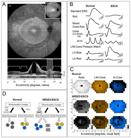 One of the IRDs being considered for therapeutic intervention is an autosomal recessive disease caused by mutations in the NR2E3 gene; this condition was first identified three decades ago using visual function testing. After a history of clinical misdiagnosis as a form of retinitis pigmentosa (RP), X-linked retinoschisis, Stargardt disease, or stationary night blindness among other disorders, it was recognized as a specific entity. Diagnostic confusion was due to the constellation of features that could include nightblindness, visual acuity loss with cystic maculopathy or schisis (Figure 1A), pigmentary retinopathy and/or fleck-like lesions, peripheral retinoschisis, progressive visual field losses, and abnormal electroretinograms (ERGs). There was rod photoreceptor dysfunction, reduced L/M-(long/middle-wavelength sensitive) cone function but the unique feature of greater-than-normal (enhanced) vision of the least populous photoreceptor subtype, the S-(short-wavelength sensitive) cones [5,6,7]. Spectral ERG stimuli were used to dissect the mechanism of the abnormal patient waveforms and the conclusion was that the signals were from S-cones [6,8,9] (Figure 1B). Chromatic perimetry in the dark- and light-adapted states revealed little or no rod-mediated vision, reduced L/M-cone function and increased S-cone function (Figure 1C). We named this condition the enhanced S-cone syndrome (ESCS) [6,7,8,9]. The basis of the hyperfunctioning S-cones was postulated to be a developmental defect in cone cell differentiation causing greater numbers of these photoreceptors (Figure 1D), and subsequently leading to retinal degeneration and blindness [9,10]. The molecular cause was later identified as mutations in the orphan nuclear receptor transcription factor gene NR2E3 [10,11,12,13]. The pathways that involve NR2E3 and determine photoreceptor cell fate continue to be investigated to the present day (for example, [14,15,16]).