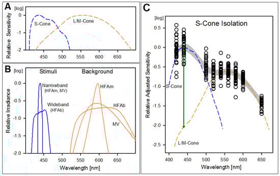 Three computerized static perimeters were studied in a cohort of normal subjects using short-wavelength stimuli and longer-wavelength adapting backgrounds to determine S-cone vision across the visual field using static perimetry [6,13,23]. This isolation method takes advantage of the difference in spectral sensitivities of the S- and L/M-cone systems, which peak at different wavelengths (Figure 2A), and the differential desensitization of each produced by a high luminance yellow background [24,25]. Our ‘standard’ (named HFAm or modified Humphrey Field Analyzer) has been a commercially available automated perimeter using an add-on narrow band 440 nm interference filter, plus a bright yellow LED (light-emitting diode)-based background. The second instrument was an unmodified HFA (named HFAb) with blue on yellow (SWAP; short wavelength automated perimetry) settings used for glaucoma testing [22]. The third instrument was a MonCvONE (named MV for Metrovision). For this study, we configured the MV perimeter to use a narrowband filter identical to HFAm to allow the instrument agreement assessment between MV and our ‘standard’ HFAm. To be noted, the commercial versions of both the HFAb and MV perimeters use a wideband filter.