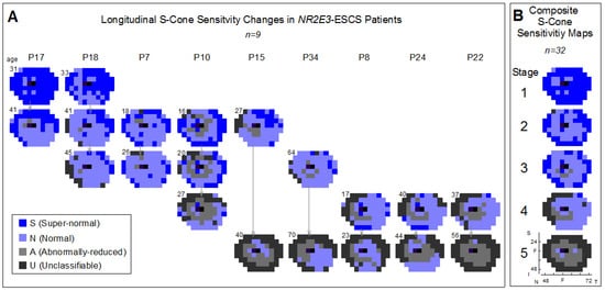 To determine how the disease progresses, we studied longitudinal S-cone sensitivity data. For patients with multiple visits (n = 9), S-cone sensitivity maps were arranged temporally and visually grouped based on patterns of S-cone function across the visual field; 5 general disease stages were identified. Composite maps were generated using a wider cohort of NR2E3-ESCS patients (n = 32 patients) to create generalized representations of the stages that show how patterns of S-cone function change across the visual field with time. Data collected during each patient’s first (or only) visit were used, so as to sample each patient once in generating the composites. Each individual map was visually categorized into one of the 5 disease stages. For each stage, a ‘mode’ rule was used to create the aggregated map: the S-cone classifier (S, A, N, or U) that appeared the most times at a given locus was assigned to that locus in the composite map. At loci where the mode could not be determined, the composite classifier was assigned based on the numerical average of the sensitivity measurements.