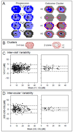Analyzing change in S-cone perimetry as an outcome. (A) Left: maps illustrating progression from one stage of disease severity to the next in NR2E3-ESCS. Right: examples of strategies to measure efficacy outcomes for treatment at Stages 1–4 based on expected progression of disease: zones A1, A2, or one of the 3–4 loci clusters (C) were selected as they would likely predict the greatest changes at each stage. (B) Two aggregation (averaging) outcome strategies: by 3–4 loci clusters (n = 19 clusters, left) and by 2-zone (n = 2 rings, right). (C) Inter-visit variability (sensitivity at Visit2 minus Visit1) and (D) Inter-ocular (right eye minus left eye). Bias and variances do not appear correlated to the measurement level.
