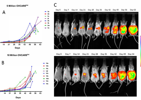2.1. Real-time Monitoring of OVCAR8luc Tumor by Bioluminescence Imaging