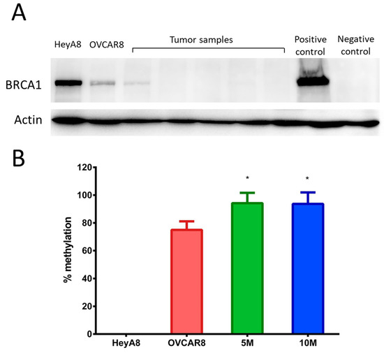 - Stefansson, O.A.; Villanueva, A.; Vidal, A.; Martí, L.; Esteller, M. BRCA1 epigenetic inactivation predicts sensitivity to platinum-based chemotherapy in breast and ovarian cancer. Epigenetics 2012, 7, 1225–1229. [Google Scholar] [CrossRef]