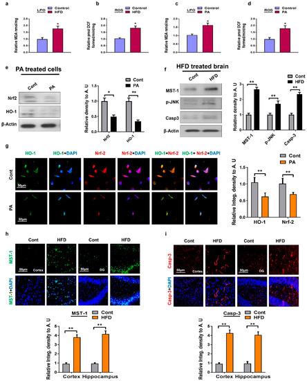 Oxidative stress is linked to a broad range of pathological disorders and several age-dependent disorders, such as neurodegenerative diseases [32,33]. In order to determine whether MST1 might mediate oxidative stress, we quantified oxidative stress in terms of reactive oxygen species (ROS) and lipid peroxidation (LPO) in the high-fat diet (HFD)-fed mice brain and HT22 cells treated with palmitic acid. For this purpose, we performed the respective ROS and LPO assays. The ROS and LPO assay results demonstrated that HFD-fed mice and palmitic acid-treated cells significantly increased oxidative stress (Figure 1a–d). Similarly, our Western blot and immunofluorescence results of palmitic-acid-treated HT22 cells show a significant suppression of the nuclear factor-2 erythroid-2 (Nrf-2) and hemeoxygenase-1 (HO-1) protein expressions (Figure 1e,g). Mitochondrial damage is considered as the potential target of lipotoxicity. Therefore, we conducted another experiment to observe MST1-mediated cell death in a p-JNK/Casp-3 dependent manner in HFD-fed mice. Compared to the control mice, our in vivo immunofluorescence analyses revealed that HFD-treated mice significantly activated MST1 both in the cortex and hippocampus regions. The immunofluorescence results were further confirmed by Western blot analyses. From these results, we can conclude that MST1 enhances the activity of the p-JNK level and its downstream neurodegenerative apoptotic marker, Casp-3, both in the cortex and hippocampal regions of HFD-fed mice (Figure 1f,h,i).