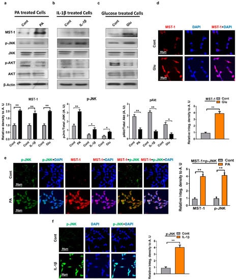 Metabolic dysfunctions regulate the expression level of MST1, p-JNK, and p-AKT in HT22 cells: (a–c) Western blot analysis of MST1, p-JNK, and protein kinase B (p-AKT) in palmitic acid, IL-1β, and glucose treated HT22 cells. The bands were quantified using ImageJ software, and the differences are depicted in the respective histogram. β-actin was used as a loading control. (d) Representative images of immunofluorescence staining showing MST1 expression in glucose-treated cells; (e) double immunofluorescence images of p-JNK and MST1 in palmitic acid treated HT22 cells; (f) representative immunofluorescence results of p-JNK expression in IL-1β treated HT22 cells. The data are shown here as a mean ± SEM. * p < 0.05, ** p < 0.01.
