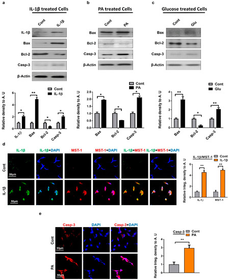 Metabolic deregulation induced apoptotic cell death in in vitro models: (a–c) Shown are the Western blot results of apoptotic markers Bax Bcl-2 can Cleaved-Casp-3 in IL-1β, palmitic acid, and glucose treated cells HT22 cells. β-actin was used as a loading control. For protein band quantification ImageJ software was used. One-way ANOVA followed by post-hoc analysis was used for statistical analysis. The density values were expressed in arbitrary units (AUs) as the mean ± SEM; (d) given are the representative images of double immunofluorescence staining of IL-1β and MST1 in IL-1β treated HT22 cells; (e) confocal microscopic results of Caspase-3 expression in palmitic acid treated HT22 cells. The data are expressed as the mean ± SEM. * p < 0.05, ** p < 0.01.
