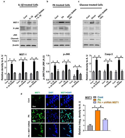 Effect of shRNA MST1 on JNK/Casp3 in HT22 cells: (a–c) Shown are the Western blot results of MST1, p-JNK, and Cleaved-Casp-3 in IL-1β, palmitic acid, and glucose treated cells HT22 cells. β-actin was used as a loading control. For protein band quantification ImageJ software was used. One-way ANOVA followed by post-hoc analysis was used for statistical analysis. The density values were expressed in arbitrary units (AUs) as the mean ± SEM; (d) given are the representative images of immunofluorescence staining MST1 in PA-treated HT22 cells; the data are expressed as the mean ± SEM. * Significantly different from the control group, and # Significantly different from the stress-induced group; * p < 0.05, # p < 0.05.