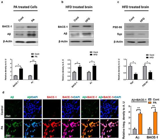 Studies have shown that oxidative stress elevates BACE1 expression and amyloid beta production through the activation of the stress kinase JNK pathway [42]. We performed Western blot analyses for BACE1 and Aβ in HFD-fed mice brain and mouse hippocampal neuronal HT22 cells treated with palmitic acid. We observed a significant increase in BACE1 expression and Aβ in the HFD-fed mice and stress-induced cells compared to the untreated control groups (Figure 5a,b). This effect was further confirmed by confocal microscopy, which showed an increased BACE1 and Aβ expression in HT22 cells exposed to palmitic acid (Figure 5d). Notably, oxidative stress along with Aβ deposition also leads to neuronal dysfunction, cell death, and a loss of synaptic connections [43]. To further evaluate the synaptic integrity, we quantified the expression of the presynaptic vesicle membrane synaptophysin (SYP) and the postsynaptic density protein 95 (PSD95) in HFD-fed mice brains. The Western blot analysis revealed a significant decrease in both the pre- and post-synaptic protein levels in HFD-fed mice compared with the control, indicating stress-induced synaptic dysfunction (Figure 5c).