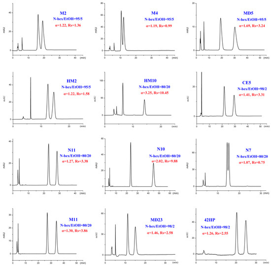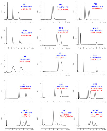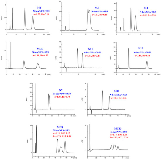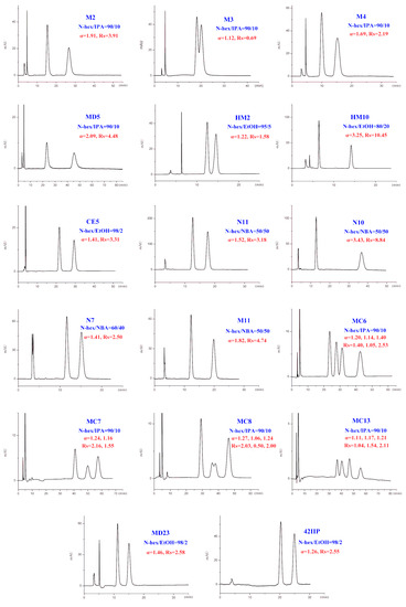In addition to different polar modifiers, the chiral separation of enantiomers was also dependent on the concentration of modifier adopted. As seen from Tables S1–S4, for M2-4, MD5, MC6-8, and MC13, IPA was more beneficial to their enantiomeric recognition. NBA was in favor of the enantioseparation of N11-10, N7, and M11. Whereas, EtOH exhibited enhanced enantioselectivity to HM2, HM10, CE5, MD23, and 42IIP. Accordingly, the effect of alcohol content on enantioseparation was investigated under these conditions. It was found that in most cases, an increase in the investigated alcohol percentage resulted in a decrease in the retention factors (k’) and enantioselectivity factor (α). For example, increasing the IPA percentage from 5 to 10% produced a notable decrease in k’ values. However, compared to k’ values, a change in the IPA percentage had a smaller effect on α values as only a slight increase in α values was observed with decreasing the IPA percentage. The obtained results suggested that enantiomeric separation depended strongly on the polarity of alcohol modifier. On one hand, by increasing the alcohol content of the mobile phase, the retention was weakened and selectivity of the column was decreased owing to the enhanced competition with analytes for the CSP, appearing in faster elution and lower enantioselectivity factor (α) values. On the other hand, the enantiomeric separation promoted by lower alcohol percentage was always accompanied with prolonged retention times as well as broader peak. Taking M2 and MD5 as example (Figure 6), the peak width obviously broadened when the percentage of the alcohol modifiers in the mobile phase reached to 5%. Therefore, considering of analysis time and resolution, the optimized chromatographic conditions under standard normal mobile phase were as follows: N-hex/IPA (90:10, v/v) for M2-4, MD5, MC6-8, and MC13, N-hex/EtOH (95:5, v/v) for HM2, N-hex/EtOH (80:20, v/v) for HM10. N-hex/NBA (95:5, v/v) for N11-10 and M11, N-hex/NBA (60:40, v/v) for N7 and N-hex/EtOH (98:2, v/v) for CE5, MD23, and 42IIP. The chromatograms of the seventeen analytes using each of the optimized separation condition are shown in Figure 7.