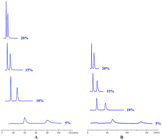 The influence of alcohol content on enantiomeric separation with IPA, (A) M2 and (B) MD5.