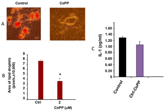 Figure 1 shows the effect of obesity in mice fed an HFD on MSC-derived adipocytes (Figure 1A). Figure 1A,B show the effect of CoPP on both the number of adipocytes as well as the effect on lipid size * (p < 0.05). CoPP administration decreases both the number and size of adipocytes. Figure 1C shows the decrease in IL-1 compared to the control. This suggests that CoPP mediated HO-1 changes to the phenotype to naive healthy adipocytes, i.e., smaller adipocytes with lower levels of IL-1.