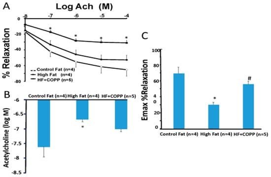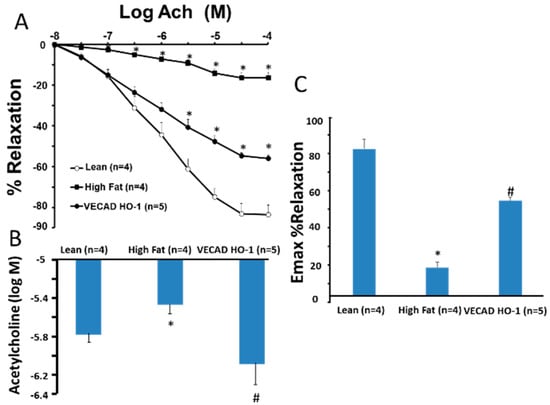 (A) shows the dose-response curves for acetylcholine-induced vasorelaxation of renal artery rings precontracted with phenylephrine. In mice with high fat diets, the acetylcholine dose-response curve was shifted down, and the 50% effective concentration (B) increased from 10−7 M to 10−4 M in rings isolated from control mice. Treatment of mice with CoPP, a HO-1 inducer, prevented high fat-induced impairment of endothelial function as the dose-response curves (C) * (p < 0.05 vs. lean and VECAD-HO-1); # (p < 0.05 vs. high fat).