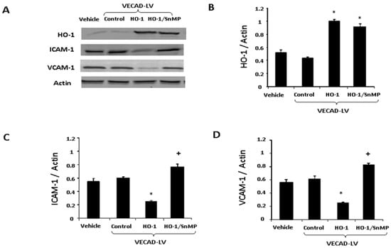Lenti-VECAD-HO-1 transfection increased expression of HO-1 (Figure 4B) and decreased expression of both ICAM-1 (Figure 4C) and VCAM-1 (Figure 4D) when compared to the control. Addition of SnMP elevated (p < 0.05) ICAM-1 and VCAM-1 when compared to the control (Figure 4).