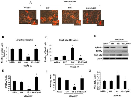 (A) Adipogenesis in MSC-derived adipocytes following administration of CM from EC treated with VECAD-GFP, VECAD-HO-1, and VECAD-HO-1 + SnMP. (B,C) Lipid droplet size of MSC-derived adipocytes following administration of CM from EC treated with VECAD-GFP, VECAD-HO-1, and VECAD-HO-1 + SnMP. (D) Western blot bands of C/EBP-α, PPAR-γ and Wnt 10b expression from MSC-derived adipocytes following administration of CM from EC treated with VECAD-GFP, VECAD-HO-1, and VECAD-HO-1 + SnMP. (E–G) Graphs depicting C/EBP-α, PPAR-γ and Wnt 10b expression from MSC-derived adipocytes following administration of CM from EC treated with VECAD-GFP, VECAD-HO-1, and VECAD-HO-1 + SnMP (*, vs. GFP p < 0.05, +, vs. HO-1 p < 0.05).