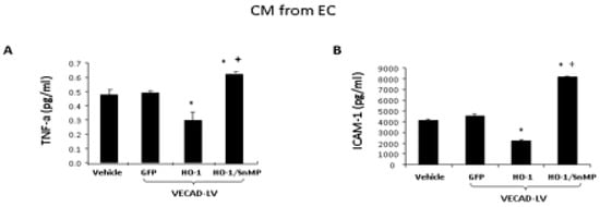 As seen in Figure 6, we examined the levels of the inflammatory cytokine (A)-TNF-α, (B)-adhesion molecule ICAM-1, CM from cells treated with VECAD-HO-1 resulted in a decrease in TNF-α and ICAM-1 when compared to the control (Figure 6). In contrast, CM from cells treated with VECAD-HO-1 and SnMP resulted in an increase in TNF-α and ICAM-1 levels compared to the control (p < 0.05).