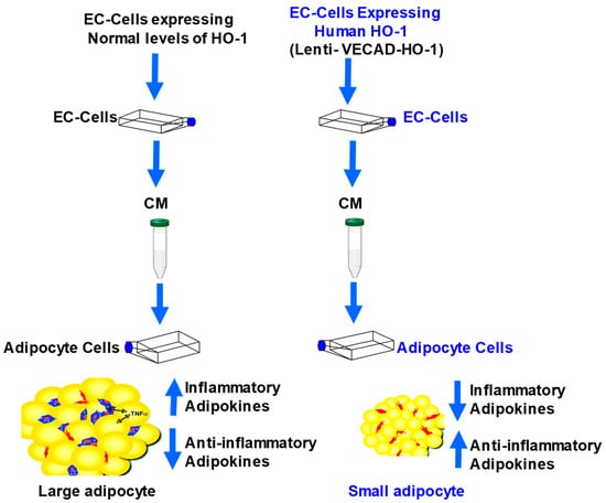 In order to specifically target the endothelium with HO-1, EC were treated for three days with lentiviral vectors. The lentiviral vectors were constructed using the LentiMax system (Lentigen, Baltimore, MD, USA) and expressed green fluorescent protein (GFP) with or without human HO-1 under the control of the endothelial-specific promoter VECAD []. Cells were infected with the lentiviral vector (2 μL of 109 transducing units [TU]/mL) carrying either the HO-1 construct with GFP under the control of the endothelium-specific promoter VECAD (VECAD-HO-1) (Lentigen). The CM from EC was collected and stored at −80 °C until analyzed. Fat derived primary adipocytes were isolated as described in []. Fat primary adipocytes were grown until 80% confluent in a T-75 flask and the medium was replaced with adipogenic medium. The adipogenic media consisted of complete culture medium supplemented with DMEM-high glucose, 10% (v/v) FBS, 10 μg/mL insulin, 0.5 mM dexamethasone (Sigma–Aldrich, St. Louis, MO, USA) and 0.1 mM indomethacin (Sigma–Aldrich, St. Louis, MO, USA). Adipocytes and MSC-derived adipocytes were cultured in adipogenic differentiation media, treated with 10% CM from the EC. Media was changed every 2 days for 14 days. The CM from MSC-derived adipocytes was collected and stored at −80 °C until analyzed.
